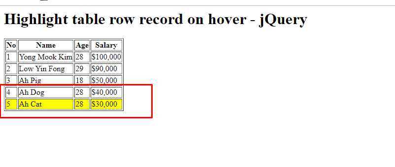 <tr><td>5</td><td>Ah Cat</td><td>28</td><td>$30,000</td></tr>